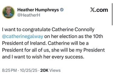 Despite the ceremonial nature of the post, her election signals a departure in tone from establishment politics. Connolly’s win has been characterised by some as a rebuke to the centrist dominance of Fine Gael and Fianna Fáil.