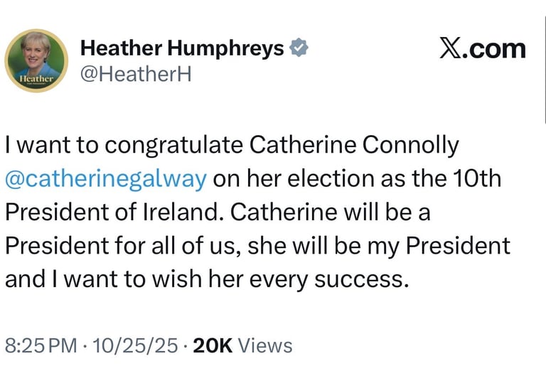Humphreys, a former cabinet minister and rural candidate for Fine Gael, conceded early. “Catherine will be a president for all of us, and she will be my president,” she told reporters. Despite the defeat, Humphreys expressed no regrets and acknowledged the mandate she lost.